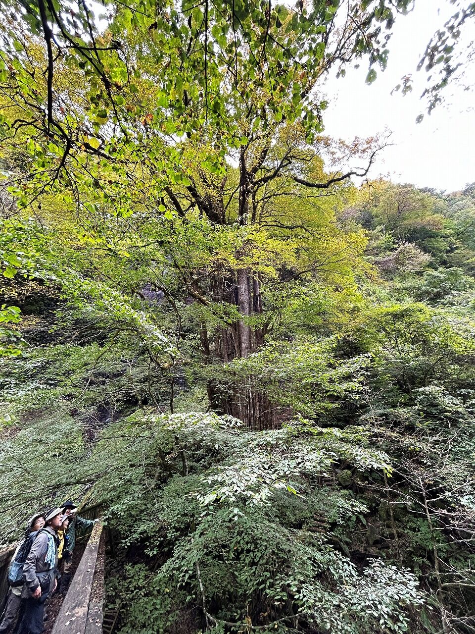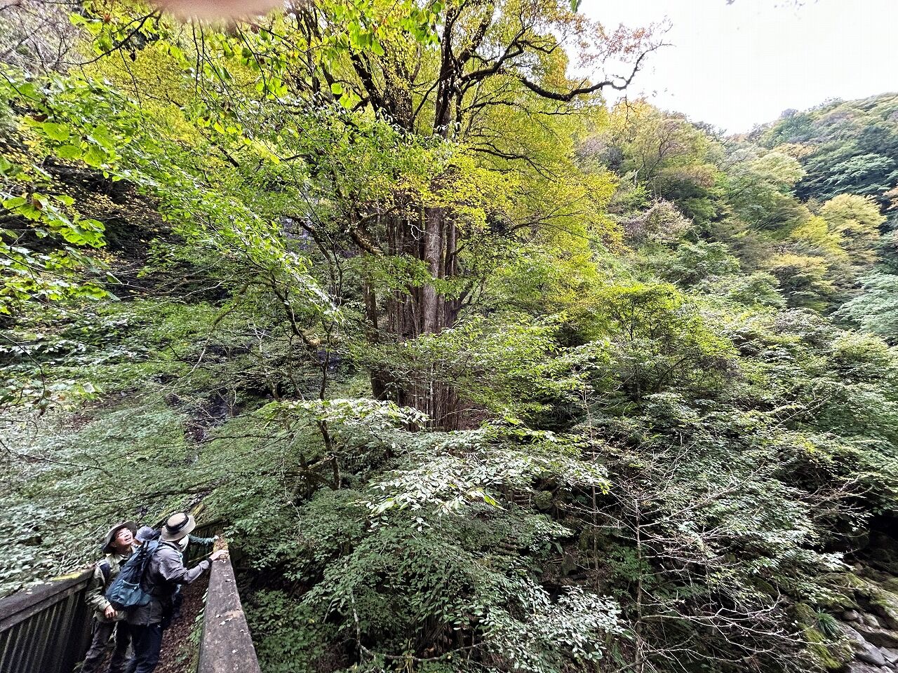 スッカン橋からみる、紅葉に輝くカツラの巨木!(雄飛の滝線歩道)
