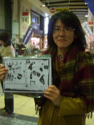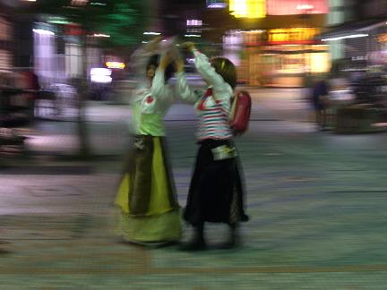 山賀ざくろ先生も出演するとの事でつい2になっていた私 中央アーケードをテクテク歩くと 旧麻屋デパート前でダンスは既にはじまっておりました 赤いカバンをしょった女の子達が踊っております(写真はすってんぺアルバイトのHARUYAMAさん)