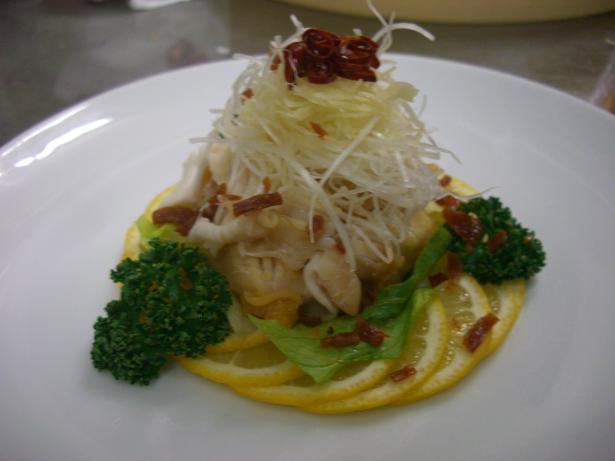 2009年01月12日 つぶ貝の刺身中華風 5 中華風つぶ貝の刺身柔らかく淡泊な味のツブガイ 今回は四川風の味付けの和え物です 熱湯でサッと茹でたツブ貝に特製ソースをかけ 唐辛子の輪切りと葱生姜の上から 熱っつ熱の油をジュッとかけ和えることで風味が増します とてもシンプルな料理ですがとっても美味しいですよ 時々コース料理で登場しております