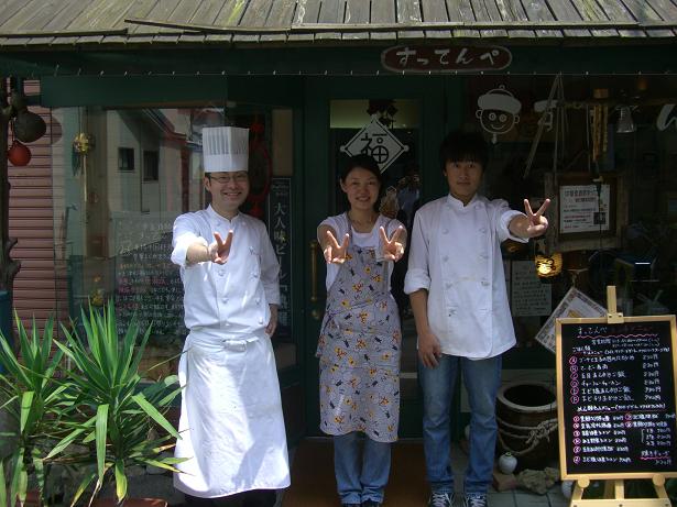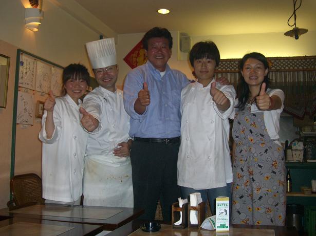 2009年07月30日 新人お手伝いの朱さんです♪ 5 新人の朱さん♪今回ご紹介するのはランチの部専属の新人アルバイトの朱(しゅう)さん(写真中央)です 朱さんは中国上海から来ました 現在、日本語をもう特訓中で多少お客さんにご迷惑をお掛けいたしますが一生懸命がんばりたいと思いますので宜しくお願い致します 写真右は王さん 左は私です 撮影は何とっウクレレ七福神 の福ロク寿様に撮って頂きました 大感謝です 頑張るぞぉ〜