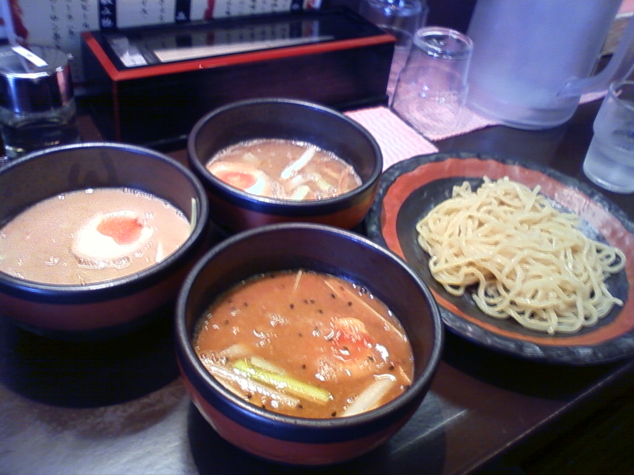 つけ麺3種特別に創作つけ麺三種類のスープを試食をさせて頂きました 珍しい味噌味 胡麻 醤油 麺も美味しくスープはちょっぴりサラサラですが深い味わいで麺もツルモチの中太麺 旨かったです 今日もいろいろと教えて頂き有難うございました 明日も行きます