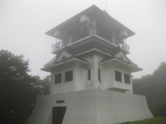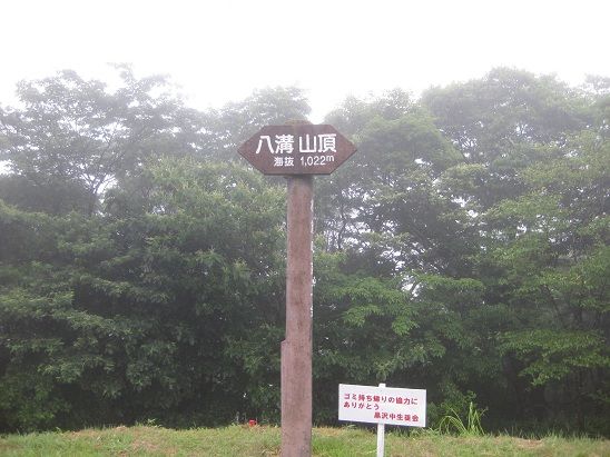 八溝山山頂大雨と風にあおられながら歩き、早くも約3分で何とっ頂上に到着。深い霧で景色は見れず、また