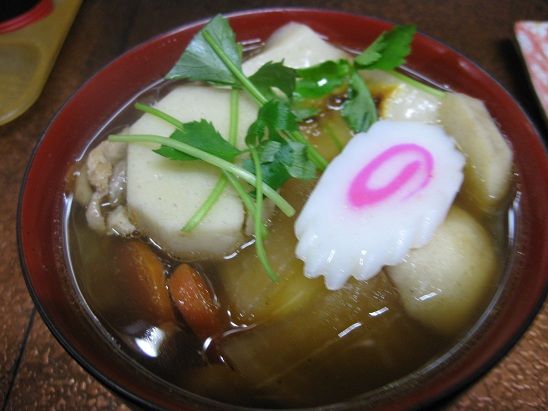 2012年01月02日 けんちん汁風お雑煮♪ 5 お雑煮今日頂いたお雑煮は焼き餅の香ばしさがたまらない、里芋や金時人参、ゴボウ、葱、鶏のもも肉、なると、大根、みつば、おもちが入った具沢山の贅沢けんちん汁風のお雑煮です。餅の形やだしの味など、地方や家庭ごとにお雑煮の種類は千差万別。今年も良い年でありますように。。。