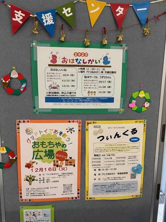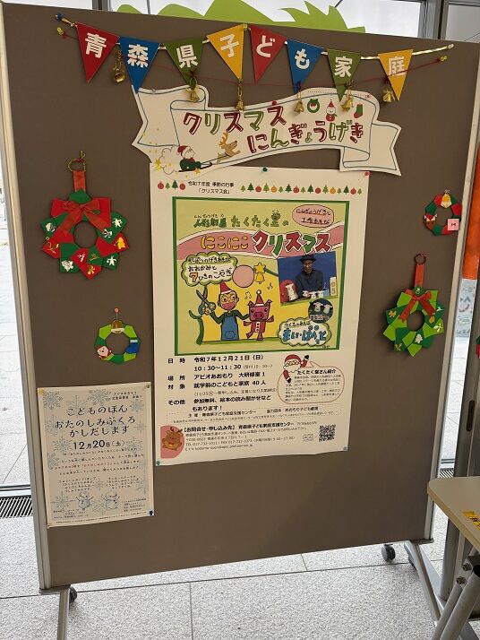 ・12月16日(火)10:00〜12:00 和式研修室にて、「おもちゃの広場あおもり」。対象は乳幼児と保護者です。お申込みは不要です。当日時間内に自由にご参加ください。