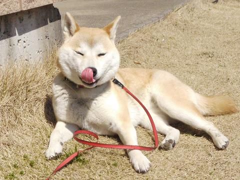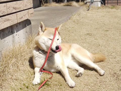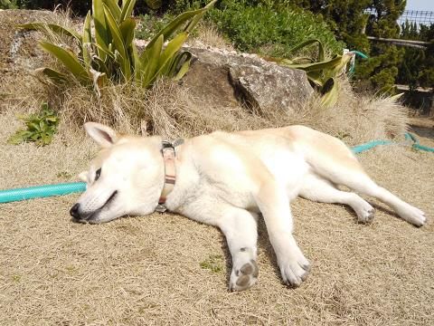 お散歩から戻ってくると、いつものようにお庭でゴロゴロ。 春の陽射しが、心地よさそう〜。