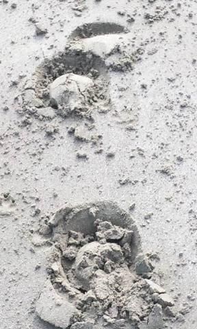 マリンは、ビビリーなくせに、大きなお馬さんの蹄の跡を見つけたので、追って先へ先へと進みます。