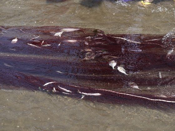 予め仕掛けて置いた網を100m程離れた2箇所のグループが、一斉にロープを引っ張って、お魚さんを囲い込