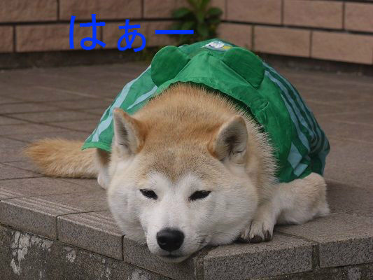 通り雨が降ってきたから、雨合羽を着せられた柴犬さん。。。