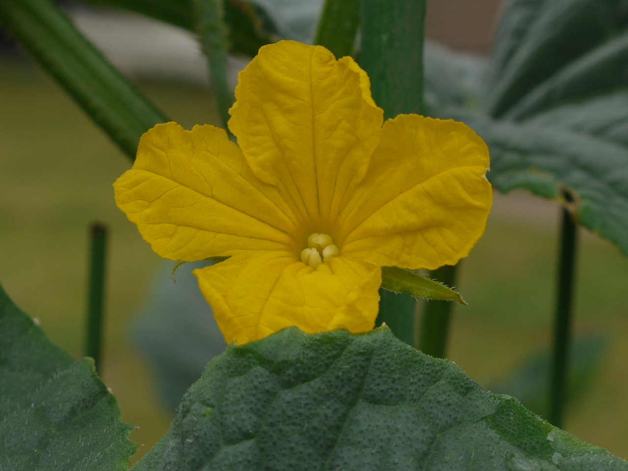 よーく見ると、花の付け根が、胡瓜の形になっていますよね? これが、雌花なのです。