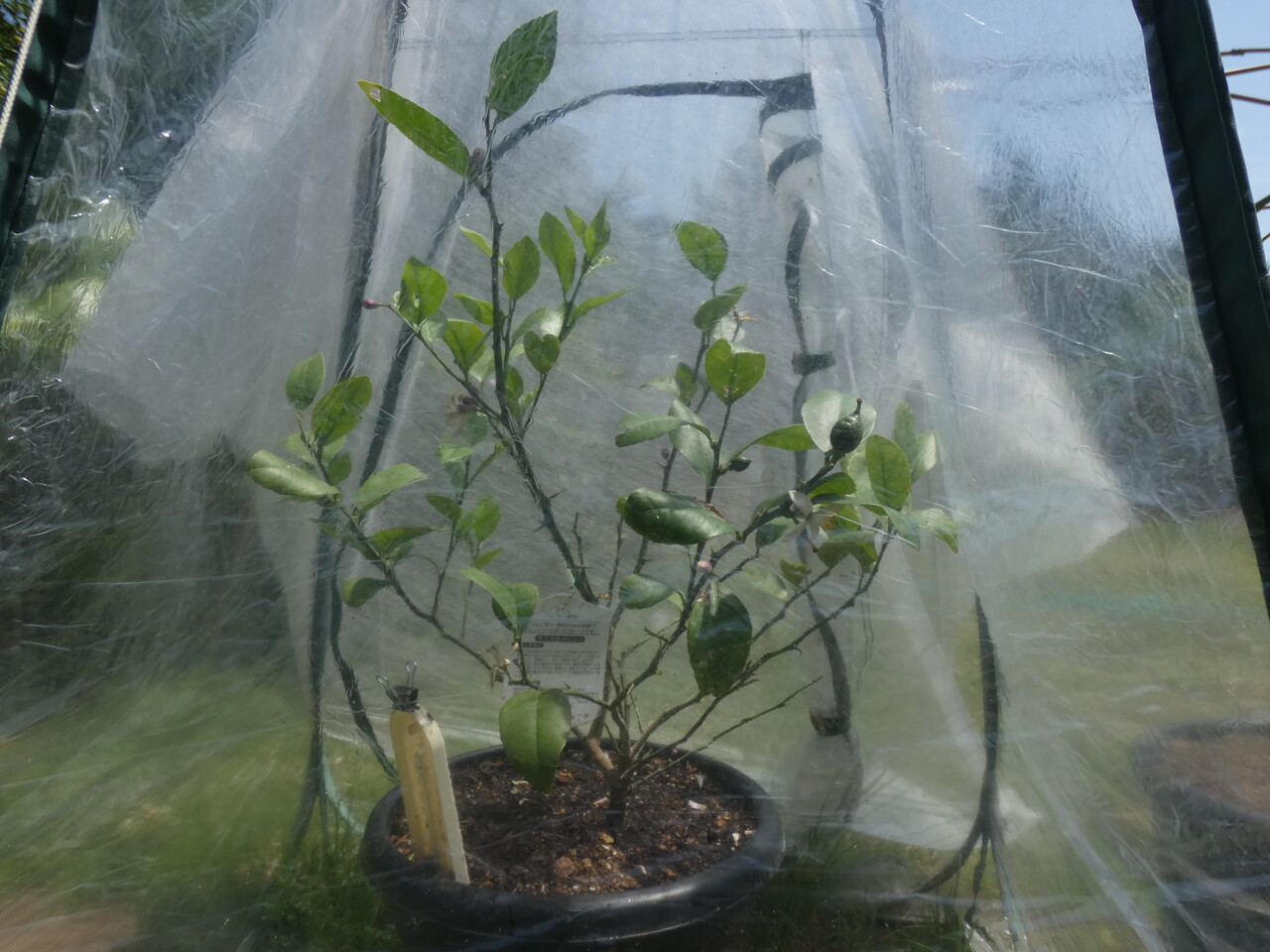 こちらは、レモン。 葉っぱ4枚に対して1個の実の割合で育てています。