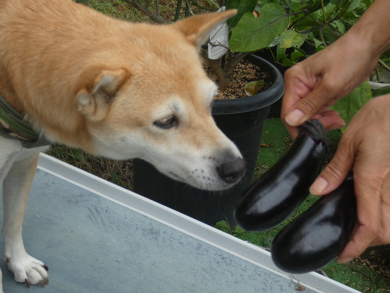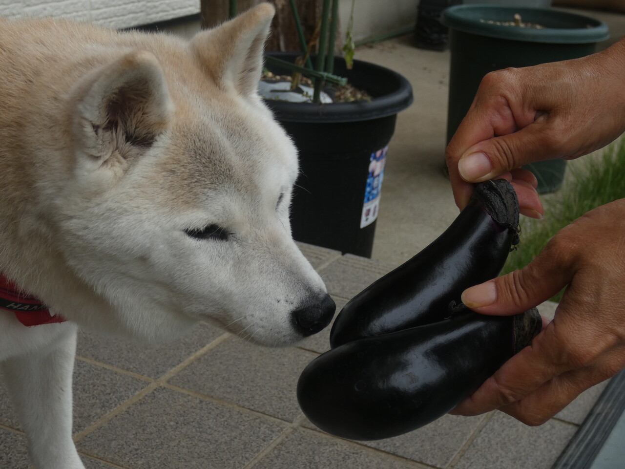 ナスは、皮をむけば、ワンちゃんも食べていいのだよ〜。 1本は、君達に!