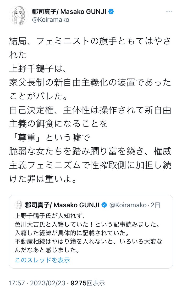 - 上野千鶴子が人知れず入籍していてドン引き。他人には独身をすすめて本まで出してるのに [2023年2月26日]