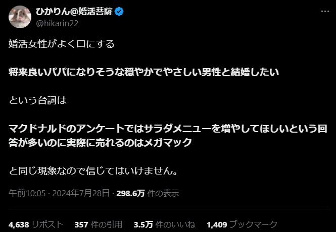 - 高望み婚活する男女があまりに多すぎる。みんな生涯未婚である事を恐れなくなった [2024年8月26日]