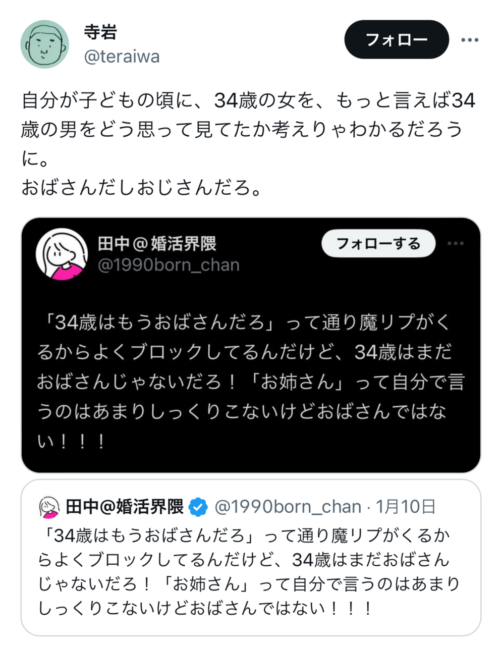 おじさんもおばさんも蔑称ではなく年上の男女を指す言葉なのに「ムキー!私はまだ34歳の(自称)お姉さんだから!」ってSNSで言えちゃうアホだから