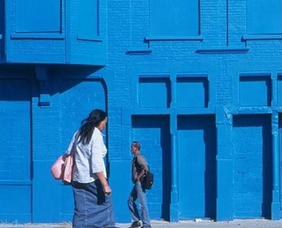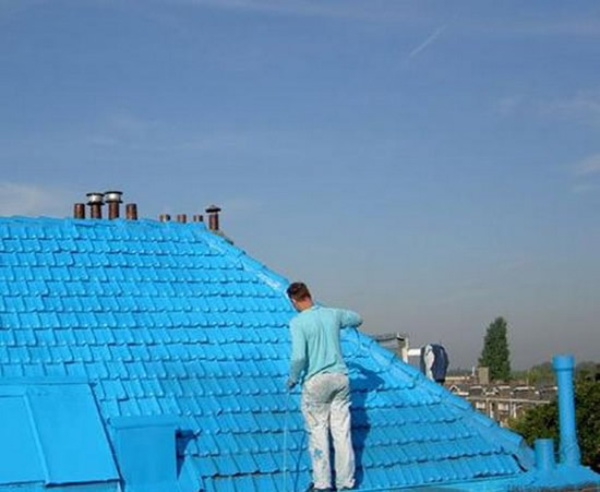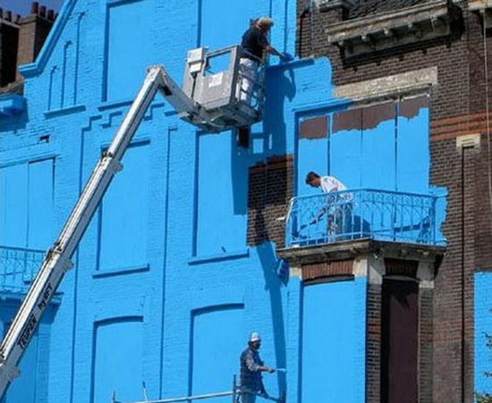 [画像:真っ青に染めてしまったロッテルダムの建物12]車道も歩道も青ペンキでべた塗り。
