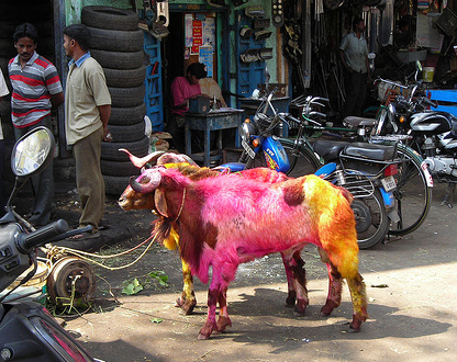 そこから羊や牛などの家畜を染めるのが流行になりつつあるようですが、着色された動物たちをご覧ください。