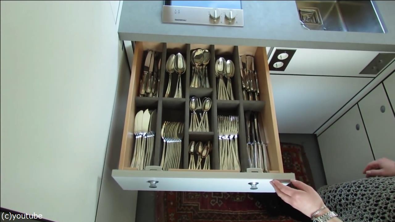 食器、カトラリーも十分すぎるほどに収納。パーティーもできそう。