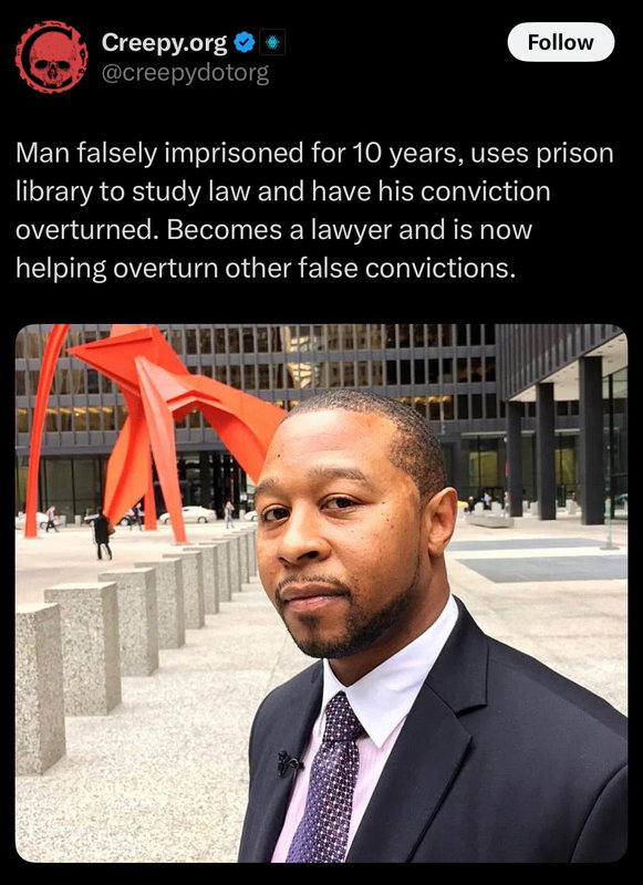 ●くろまるラジオのCNN実録犯罪番組でこのエピソードを聞いたけど、感動的だった。弁護士なんてなりたくなかったのに、刑務所の中でさえも勉強して未来をつかみ取った。今は受刑者にこういったリソースが提供されているのか疑問に思うよ。民営化された刑務所システムがそんなこと許すわけがない。絶対にあり得ないと思う。刑務所の民営化を撤廃しろ!!!!!!