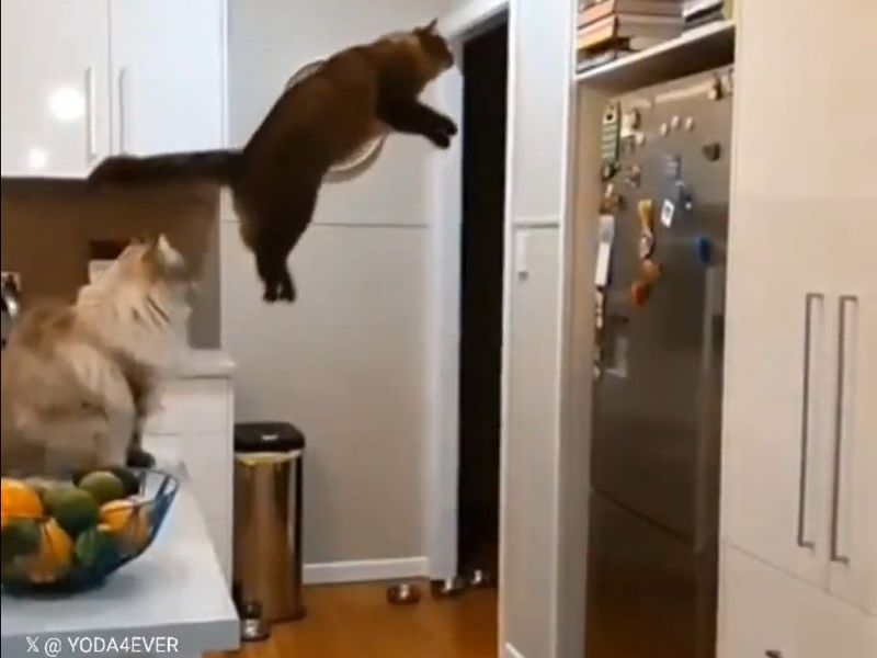 棚まで跳ぼうとする、2匹の猫の比較をご覧ください。
