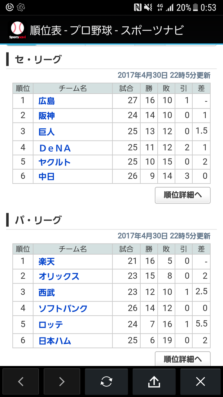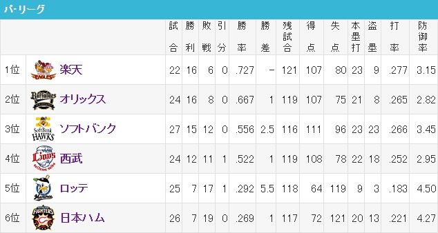 セ・パ両リーグ3.4月終了時点の順位を去年と比較してみた 2017年05月03日 カテゴリ:順位(予想) Screenshot_20170502-005329 1: 風吹けば名無し@\(^o^)/ 2017年05月01日(月)08:31:47 ID:Scq 2016巨人 15勝10敗3分.600 打率.251 防御率2.84広島 16勝12敗0分.571 打率.283 防御率3.69中日 14勝12敗2分.538 打率.264 防御率4.03阪神 14勝14敗2分.500 打率.249 防御率3.64ヤク 13勝15敗1分.464 打率.276 防御率5.14横浜 9勝18敗2分 .333 打率.225 防御率3.322017広島 16勝10敗1分 .615 打率.268 防御率3.41阪神 14勝10敗0分 .583 打率.243 防御率2.76巨人 13勝12敗0分 .520 打率.247 防御率2.72横浜 11勝12敗2分 .478 打率.241 防御率3.57ヤク 10勝15敗0分 .400 打率.229 防御率3.08中日 9勝14敗3分 .391 打率.244 防御率3.45 【セ・パ両リーグ3.4月終了時点の順位を去年と比較してみた】の続きを読む タグ :#ロッテ #横浜 #オリックス