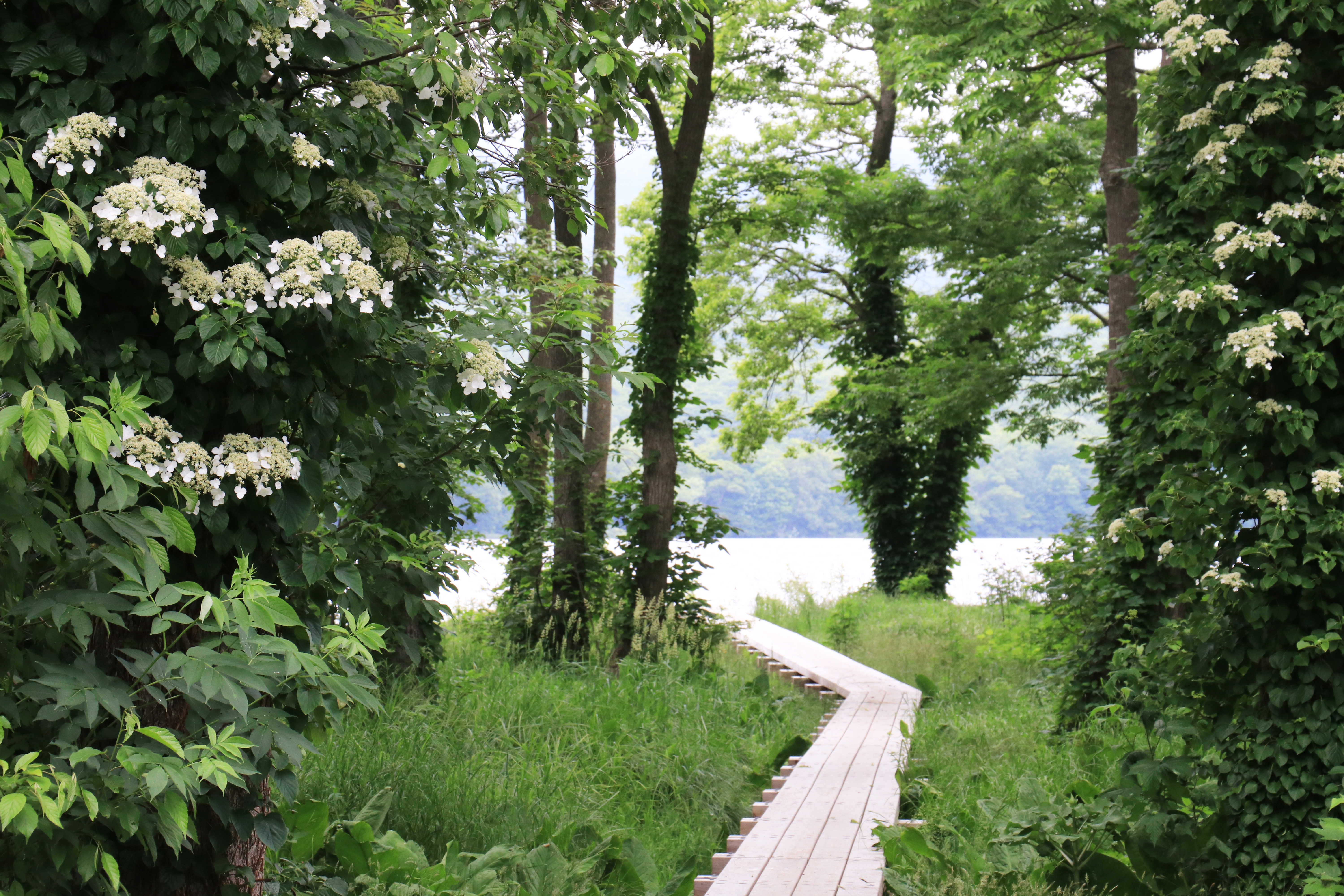 湖畔の心地よい風に吹かれながら、木立の中を行きます。