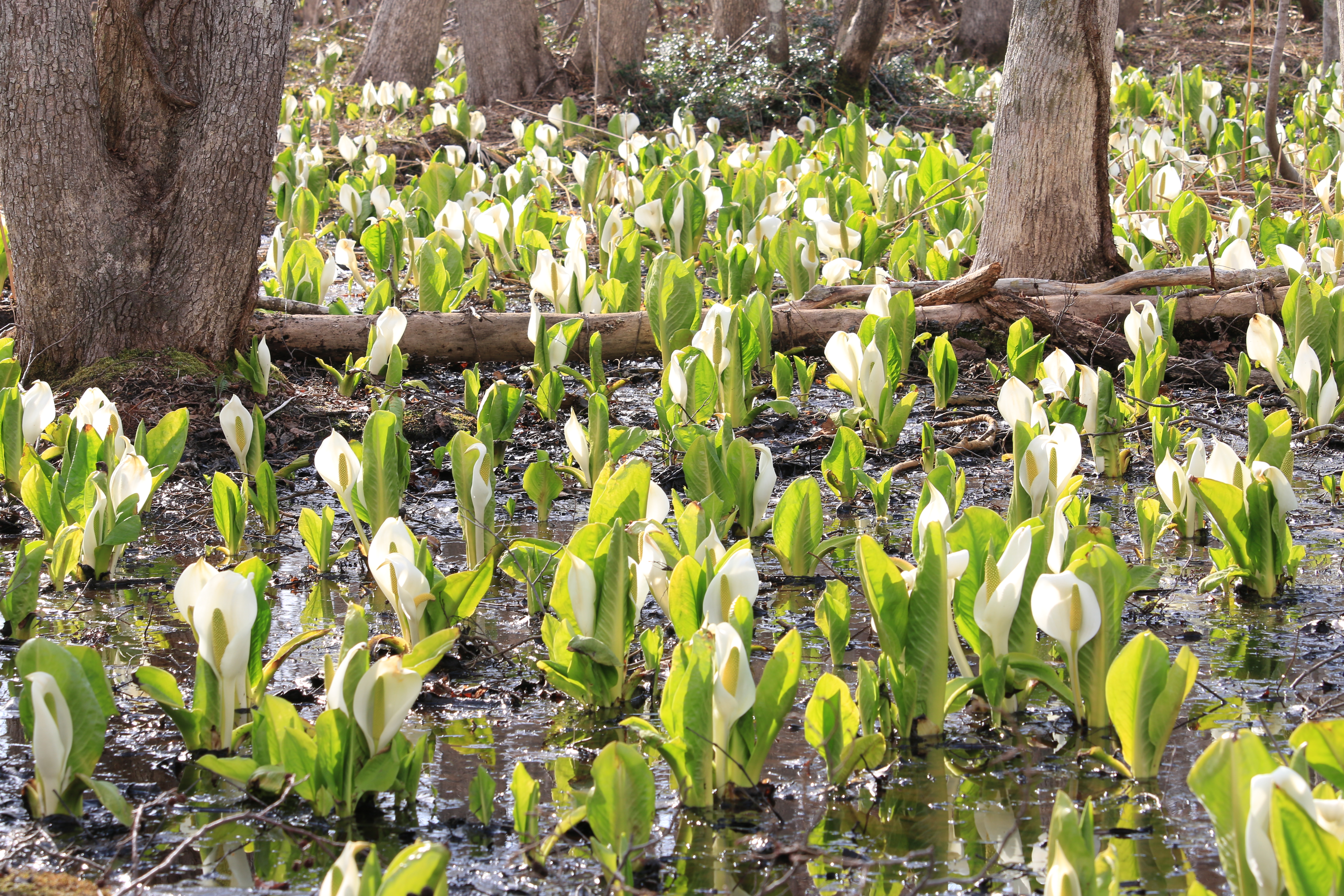 雪の中から福寿草やミズバショウの芽が顔を出す4月上旬ころ。
