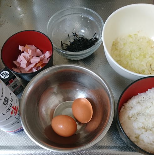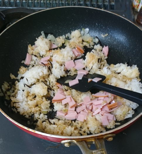 no title 材料:醤油、ひじき、卵、ご飯、玉ねぎ、ハム、食紅(黒)、塩コショウ