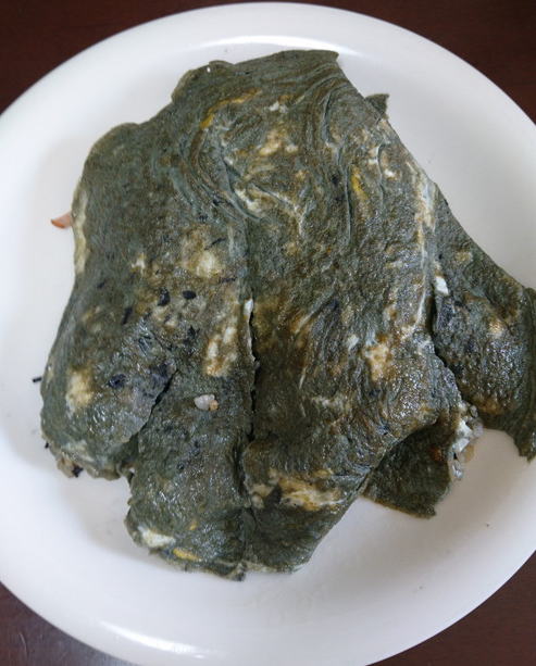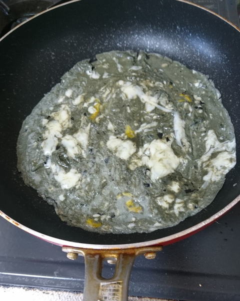 オムライスの中身は和風の味付けのチャーハンですno title 卵に食紅を合わせ、色を黒くしていきます