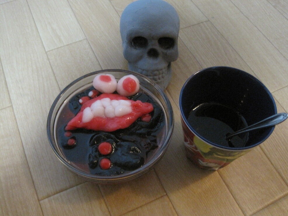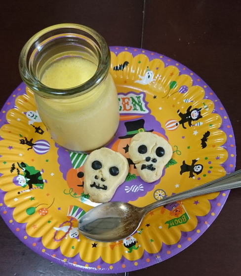 目玉はいくつか作ったのですが、唯一綺麗に出来上がったのが写真。ゼラチンで作るレシピより、寒天を用いた方が圧倒的に美味しいことに今回気付きましたno title かぼちゃプリンとガイコツクッキー
