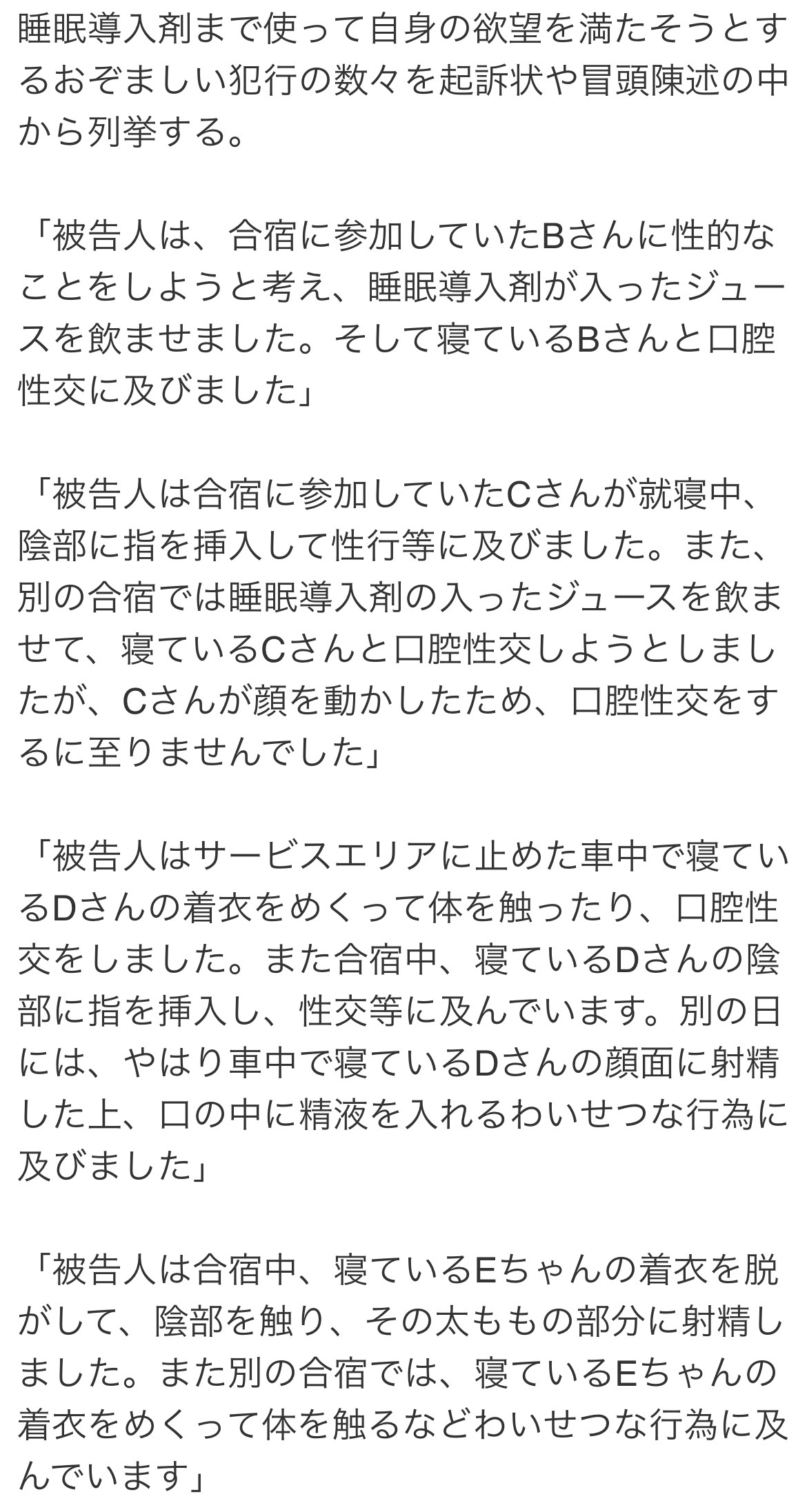 起訴状によると、2021〜24年、被告は千葉県内の宿泊施設などで児童7人に性的暴行を加え、18歳未満の少女に自宅でわいせつな行為をしたほか、合宿中、当時11歳の男児1人の口に無理やりしょうゆを流し込むなどしたとしている。
