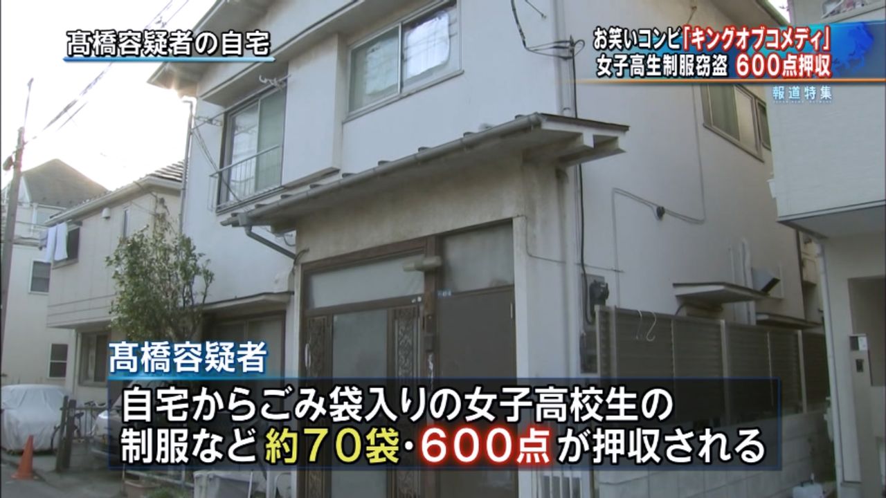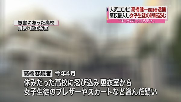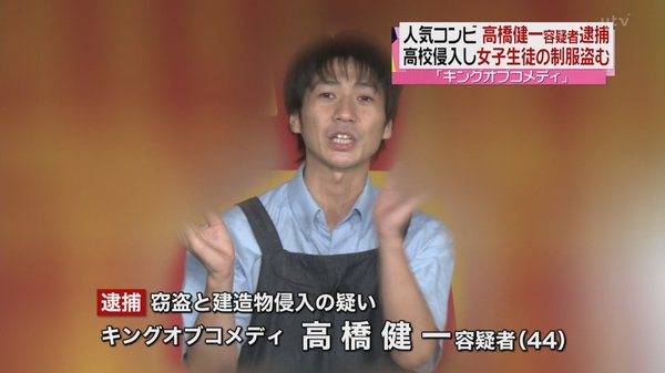 人気お笑いコンビ「キングオブコメディ」の高橋健一容疑者(44)が女子高生のブレザーや制服を盗んだ疑いで26日午後、警視庁に逮捕された。テレビ朝日などメディア各社が一斉に報じている。