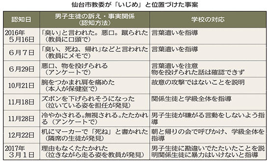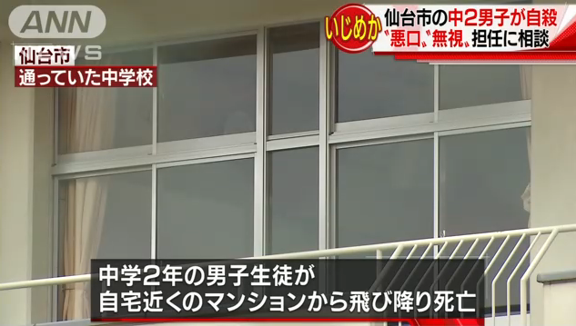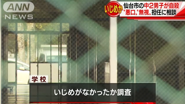 先月26日、仙台市の中学校に通う2年生の男子生徒が、休み時間に学校を出て、自宅近くのマンションから飛び降りて死亡し、警察は男子生徒が自殺したと見ています。市の教育委員会が調査していますが、これまでに男子生徒が同級生から、「臭い」などと悪口を言われたり、机に「死ね」と落書きされたりするなどのいじめを受けていたことがわかっています。
