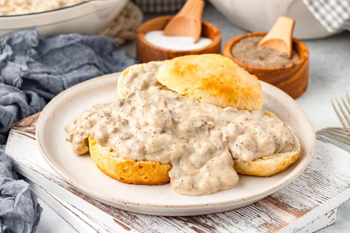 柔らかい焼きたてのバターミルクビスケットに濃厚なソーセージグレイビーソースがかかってる