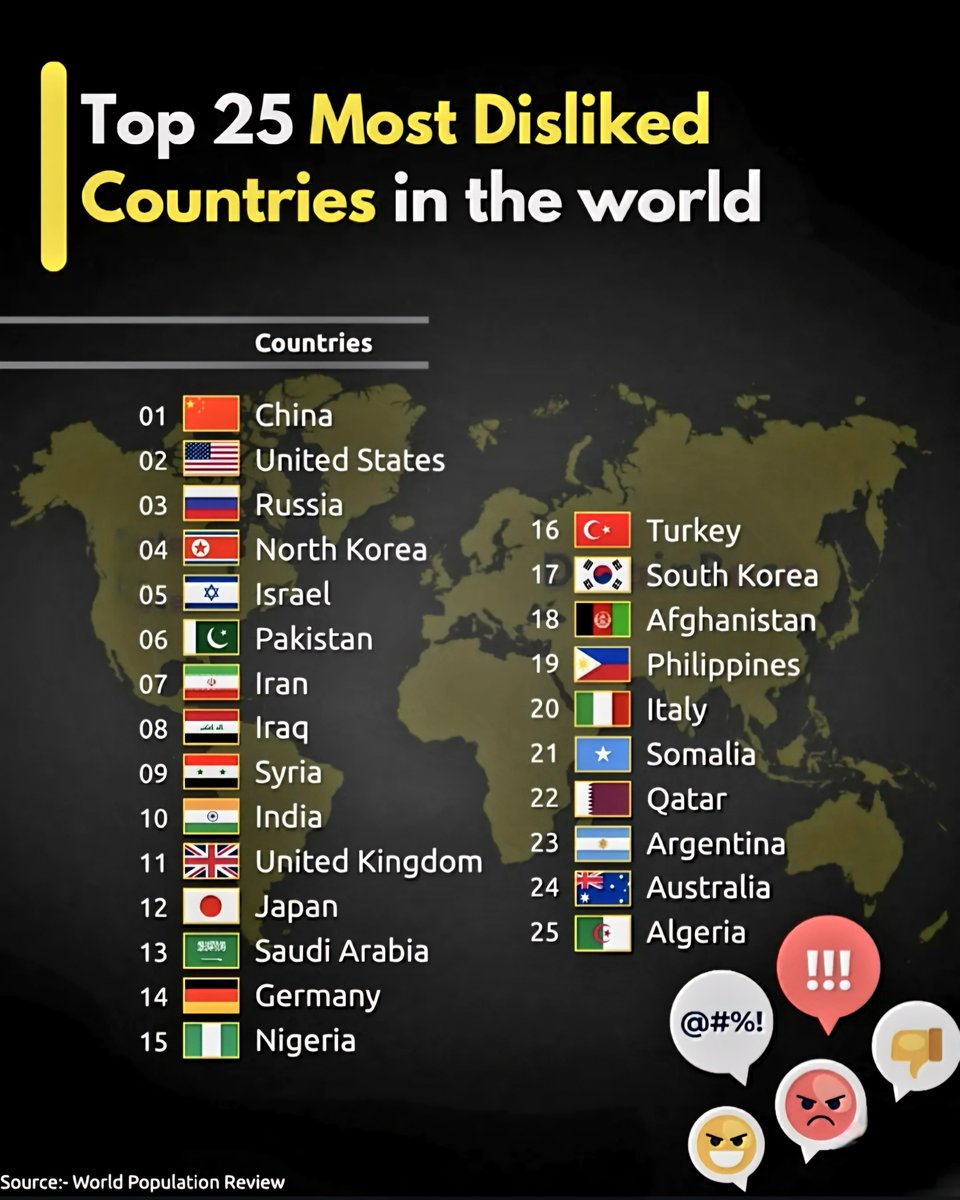 せめて1つの国で嫌われている国TOP10を出して、順位に応じて点数つけて、それで世界ランキング作らないと