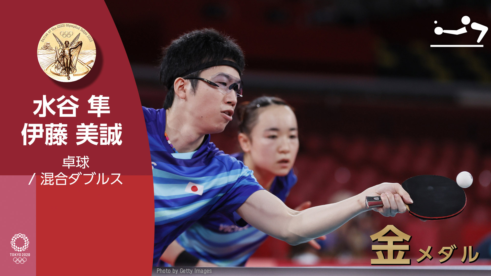 混合ダブルス決勝で日本の水谷隼(32)=木下グループ=、伊藤美誠(20)=スターツ=組が、中国の許シン、劉詩ブン組に4―3で勝利。初開催となった種目で日本卓球界初の金メダルを獲得した。日本ペアは先に2ゲームを奪われたが、第3ゲーム以降はコートを広く使った攻撃で主導権を握って逆転。一度つかんだペースを最後まで離さずに、栄冠をつかみ取った。(Yahoo:スポーツ報知)