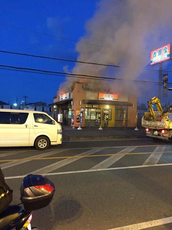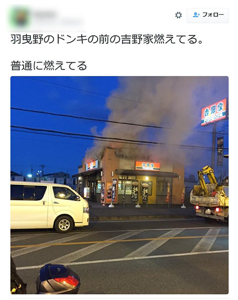 羽曳野のドンキの前の吉野家燃えてる。 普通に燃えてる