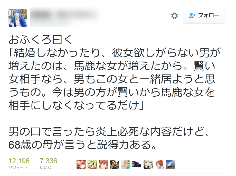 「結婚しなかったり、彼女欲しがらない男が増えたのは、馬鹿な女が増えたから。賢い女相手なら、男もこの女と一緒居ようと思うもの。
