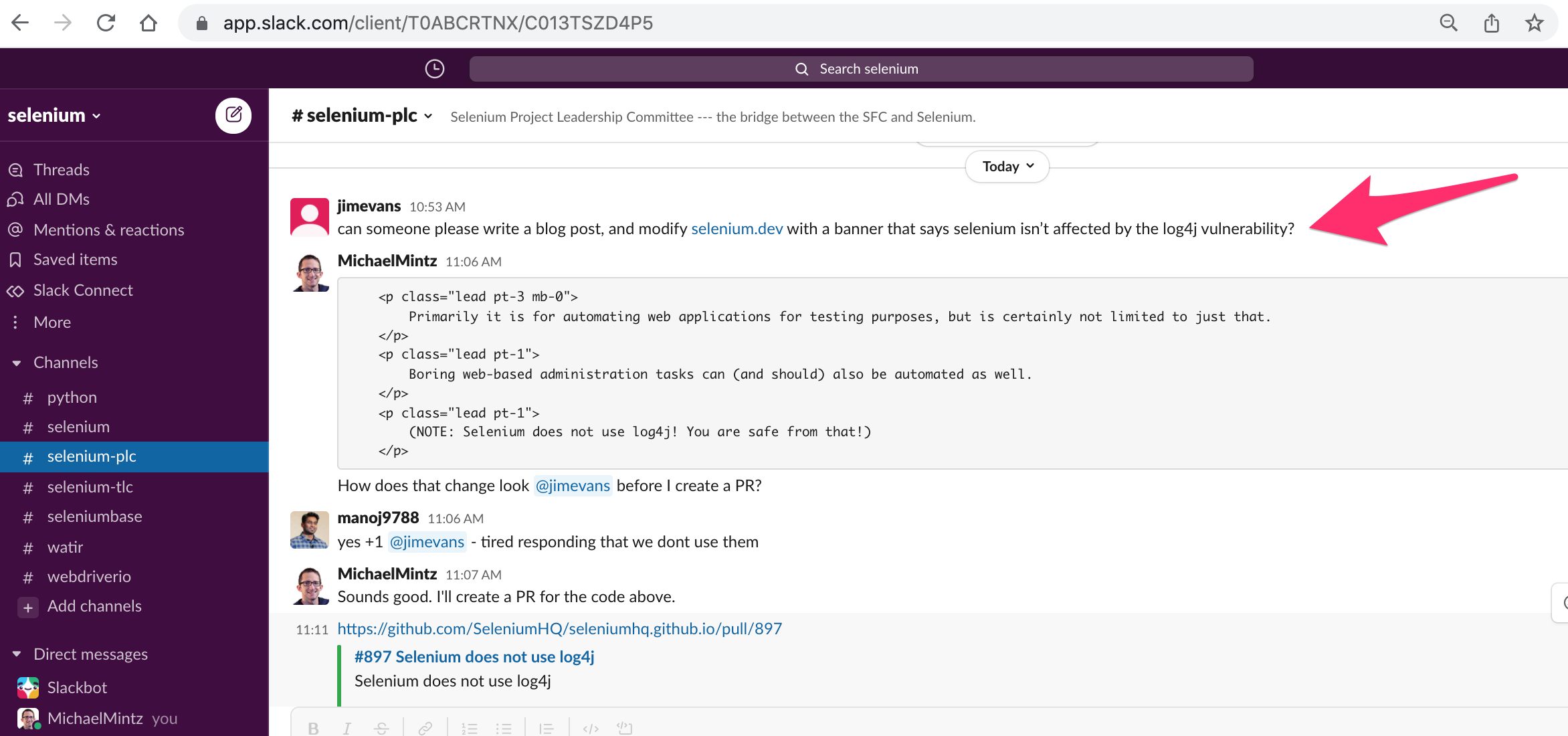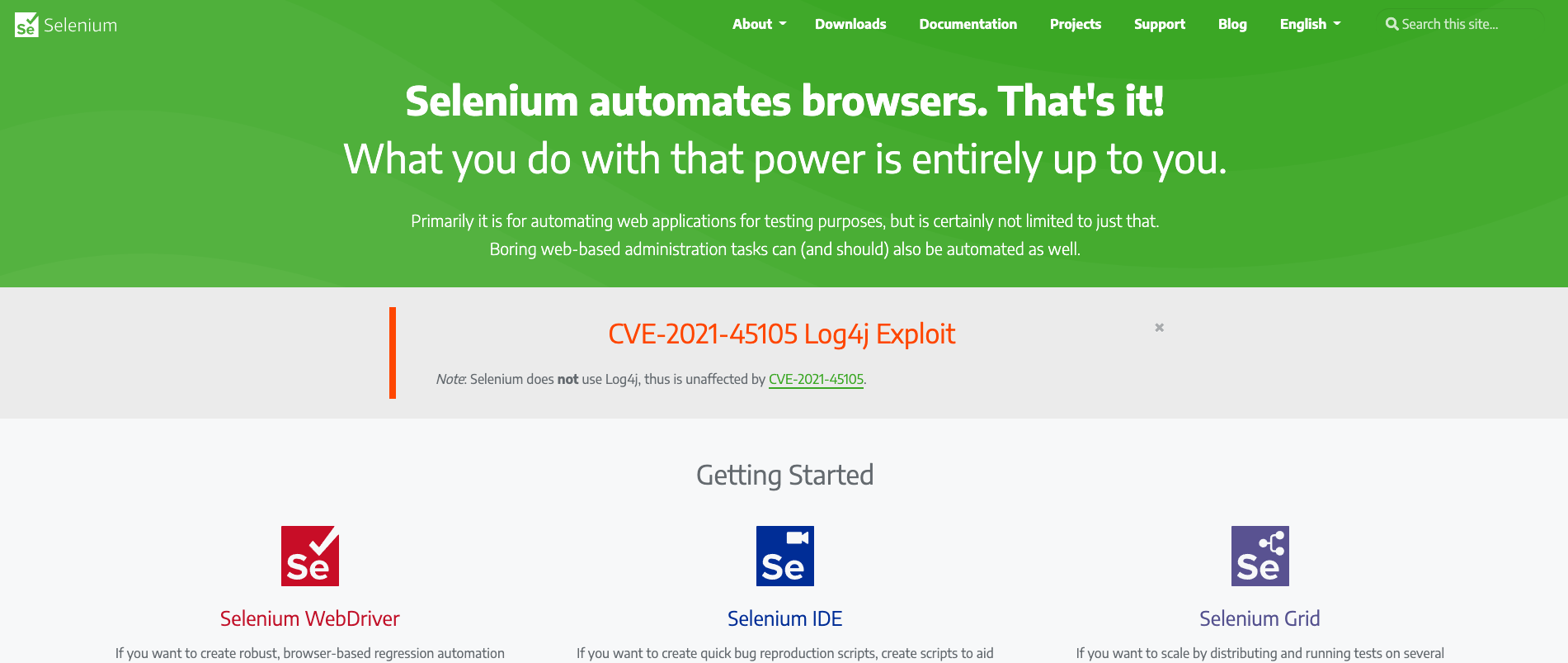 site_source_filesdirectory) and so I would only be guessing the new structure that you'd want for that, and that would likely involve a lot of back-and-forth PR questions and comments like this. I picked a reasonable alternative (the bold text is still noticeable) and since I imagine that this special message will only be up for about a month (at which point all major Selenium users concerned about Log4j would already understand that Selenium does not use it) then the styling of the message isn't too significant. After-all, this is a temporary message to begin with.