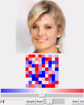 - You can select different entries from the subset of the celebA validation set (included in this repository as an .npz) by typing in a number from 0-999 in the bottom left box and hitting "infer."