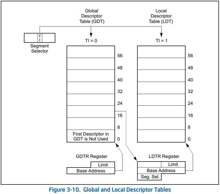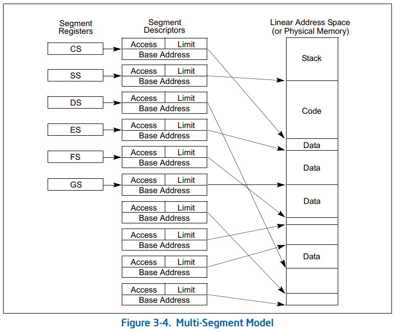 - When using the segmented memory model, each segment register is ordinarily loaded with a different segment selector so that each segment register points to a different segment within the linear address space.