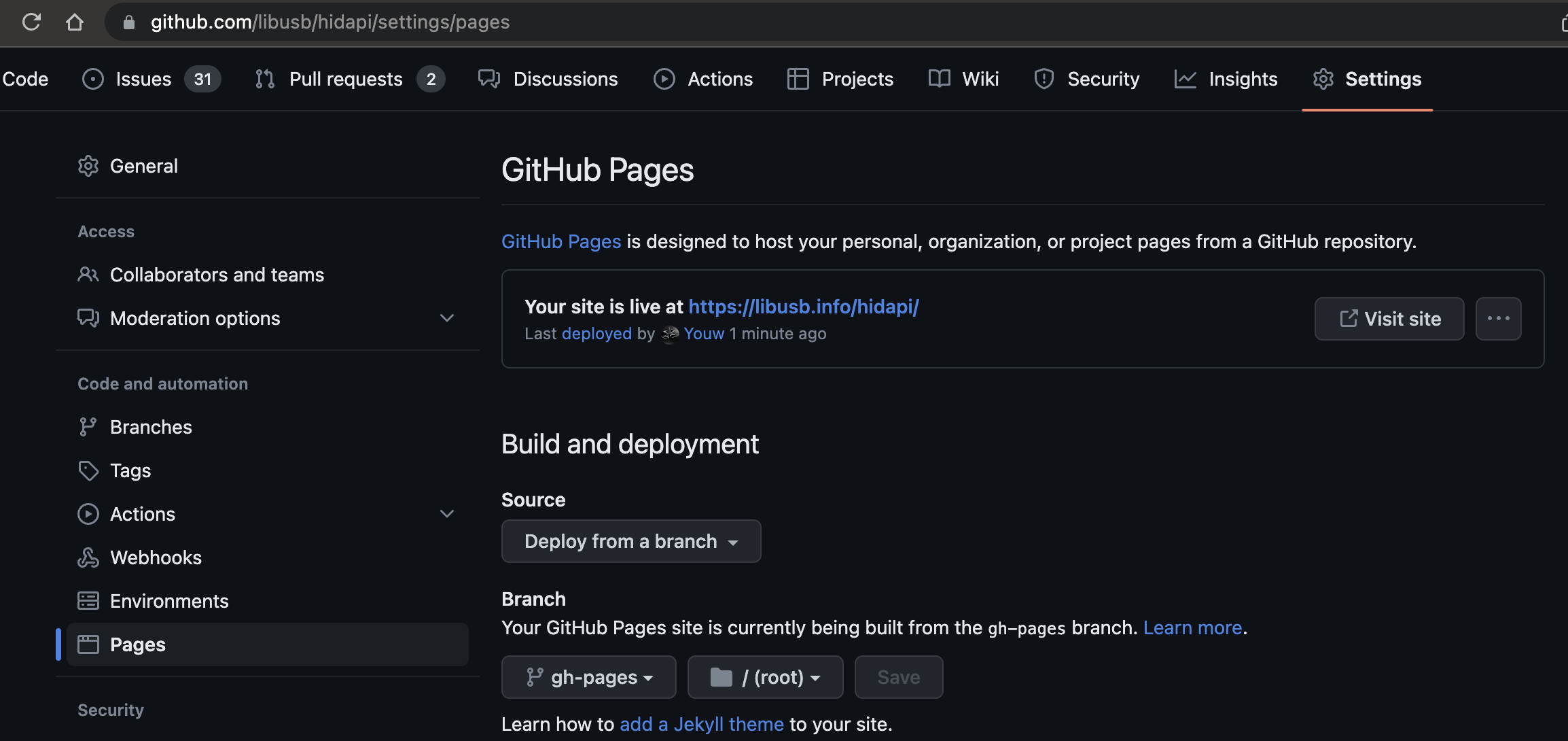 github_pages, but I think that branch was meant for a different purpose. The branch published to github pages typically only has the site's HTML resources (not any programming or documentation sources) -- especially when using Doxygen as the static site generator.image