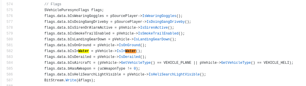 if (flags.data.bIsInWater != pVehicle->IsInWater()) { ... }Correct me if it's wrong