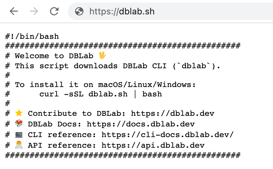 - https://cli.dblab.dev/ and https://dblab.sh – CLI setup script (works on macOS/Linux/Windows: curl -sSL dblab.sh | bash)