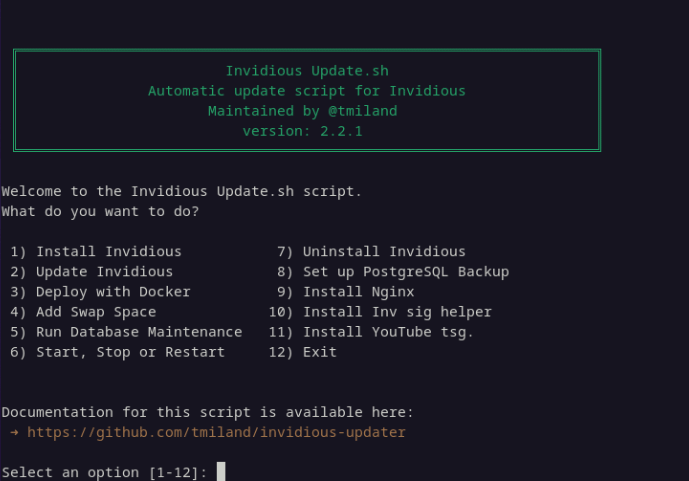 11) Exit"Usage: invidious_update.sh [options] If called without arguments, installs Invidious. --help |-h Display this help and exit --install-invidious |-i Install Invidious --cron-update |-c Update Invidious with cron --database-maintenance |-m Database Maintenance --install-log |-l Activate logging --install-inv-companion |-iic Install Invidious Companion