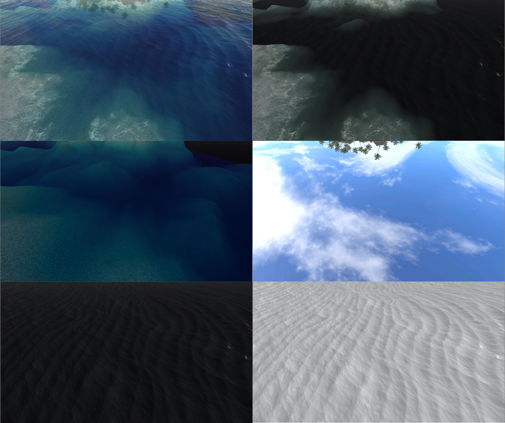 Composition of the water(final, shore, refraction+depth colour, reflection + distortion, diffuse + ambient, normals): water-layers