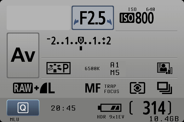 En la barra superior, verás DISP 0, 1, 2 o 3. Cada uno de esos números es una configuración personalizada de la configuración del menú LiveV. Puedes, por ejemplo, configurar DISP 1 con false colors, DISP 2 con zebras y focus peaking, y DISP 3 con clear display.
