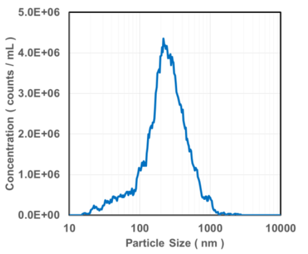 得られた粒子径分布より、メジアン径は 223 nm、個数濃度は ×ばつ108 counts / mL でした。