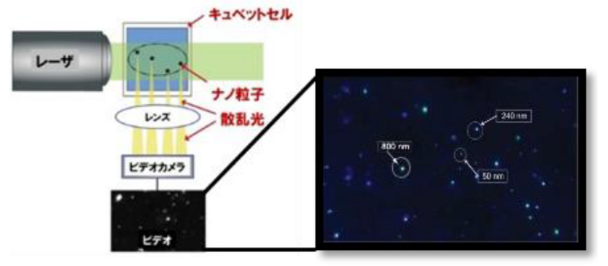 キュベットセルに注入したサンプルにレーザ光を照射し、ブラウン運動している粒子の散乱光や蛍光をビデオカメラ(カラーCCD カメラ)上で可視化します。ビデオ画像から個数濃度を、ビデオフレーム間の移動距離から拡散係数を求め Stokes-Einstein式から粒子径を求めます。
