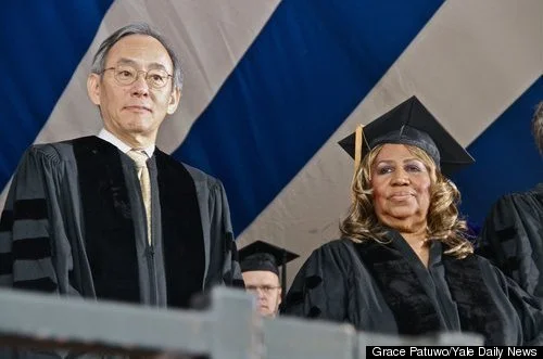 Aretha Franklin and Secretary of Energy Steven Chu were among the honorary degree recipients. According to the Yale Daily News' Twitter feed, the university was unsure if Franklin was going to show and printed two inserts for the program. But the singer appeared, hat and all. (The Yale Concert Band played "Respect" as Franklin walked to the podium to accept her degree.)