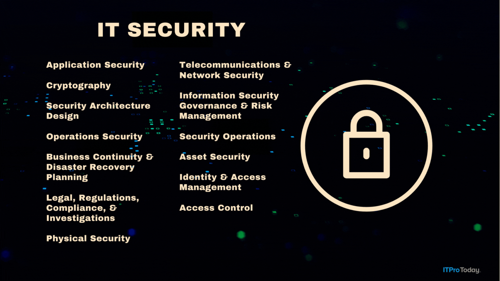 IT security is the practice of protecting IT resources like systems, data, and networks. The field is broad and includes various subcategories or domains.